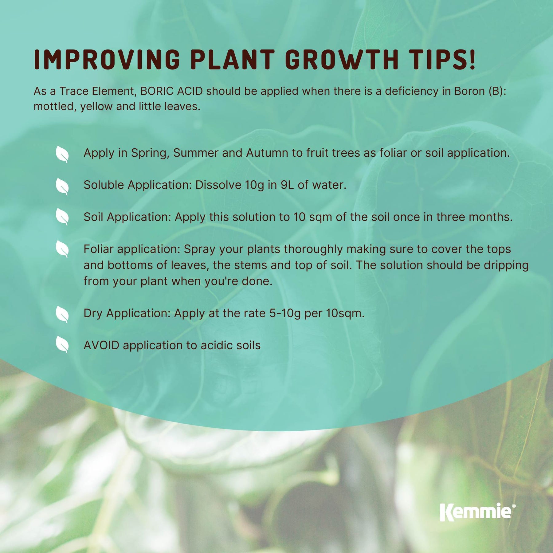 - As a Trace Element, BORIC ACID should be applied when there is a deficiency in Boron (B): mottled, yellow and ‘little’ leaves.