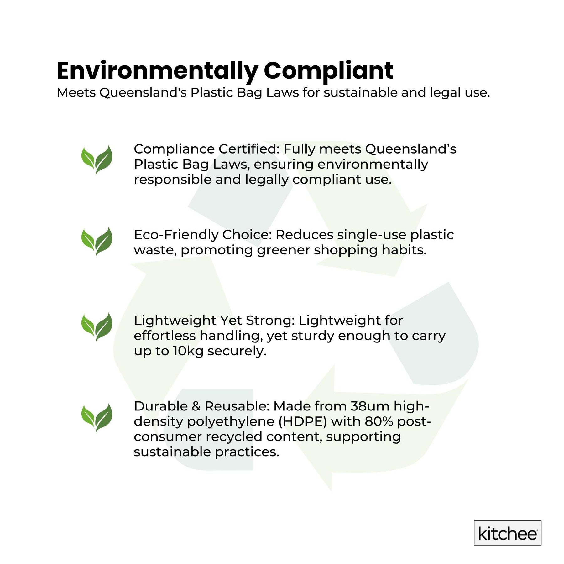 - Compliance: QLD Compliant and adhere to most Australian Reusable Plastic Bag Regulations.
