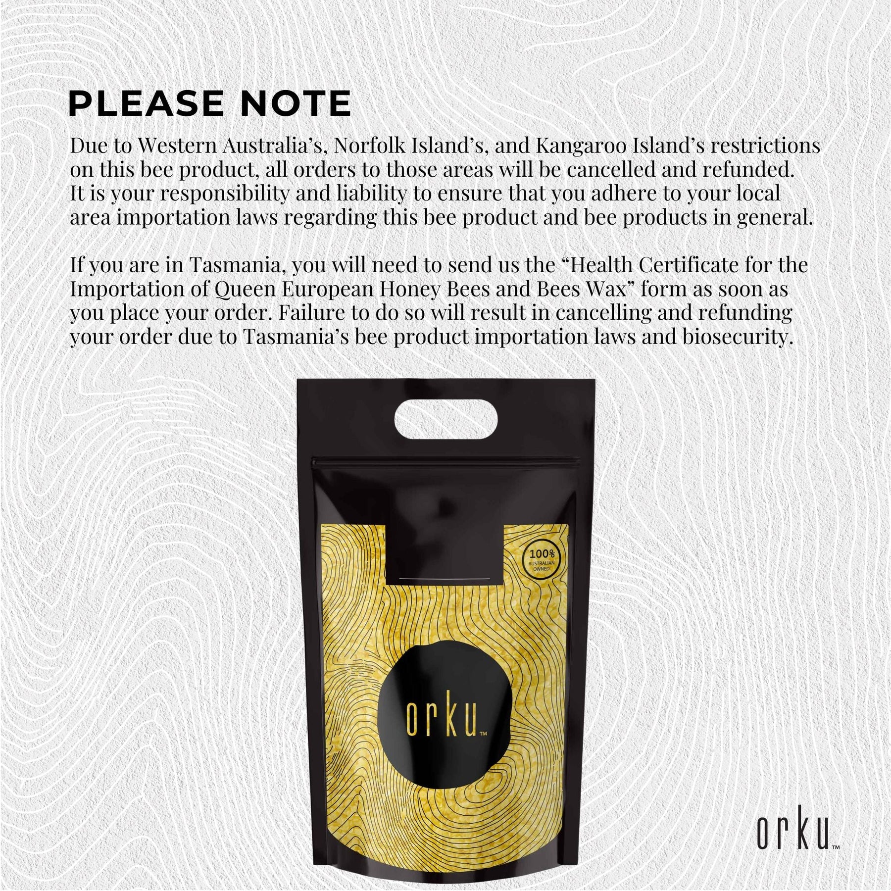 Due to Western Australia’s, Norfolk Island’s, and Kangaroo Island’s restrictions on this bee product, all orders to those areas will be cancelled and refunded.
