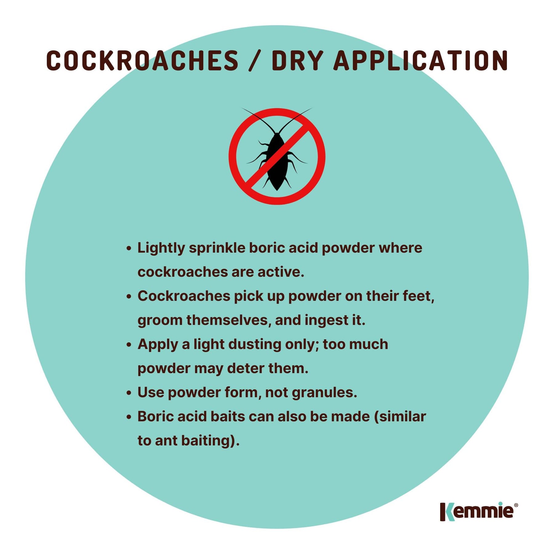 Cockroaches clean themselves every few seconds. Boric acid powder can be lightly placed on surfaces where cockroaches are found. They will run over the boric acid powder, clean their feet, and then die from consuming the boric acid on their feet. Do not apply too much as bugs can detect the boric acid and may avoid it. Granular boric acid does not work well for this application. It must be powder. Baits can also be made (see ants)