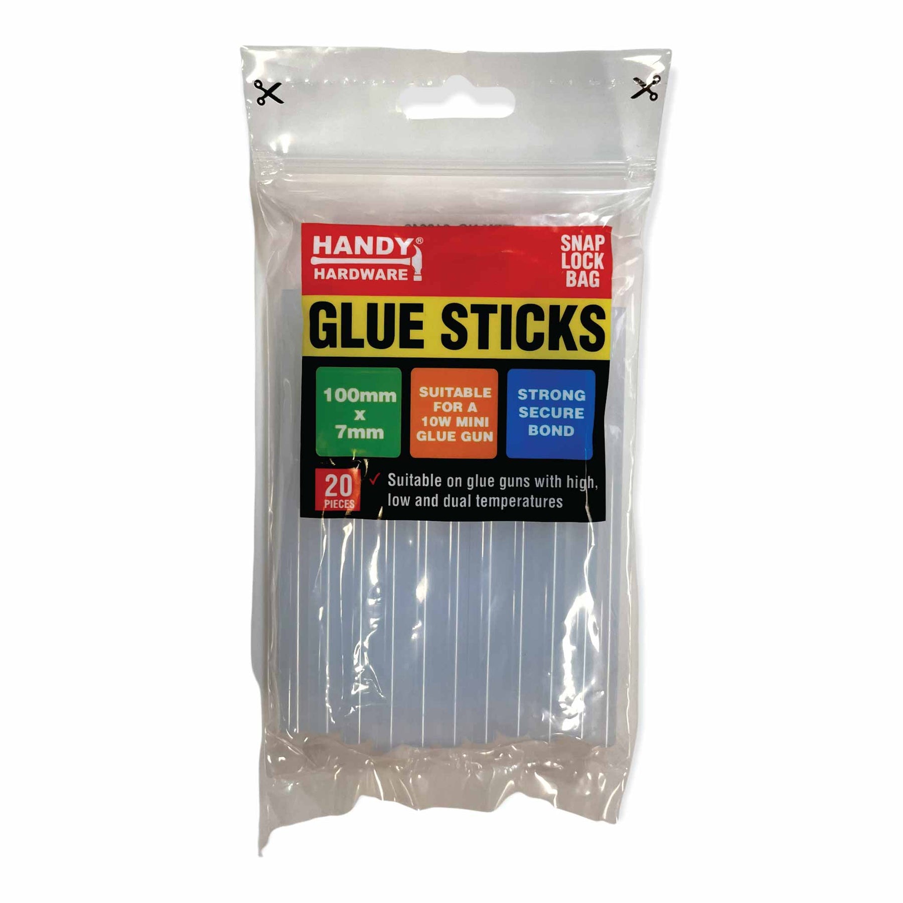 Handy Hardware Hot Glue Sticks heat up quickly so you can instantly bond materials together including fabric, plastic, paper, wood and more. It bonds in as little as 60 seconds and dries clear. Suitable for a 10w large glue gun.
