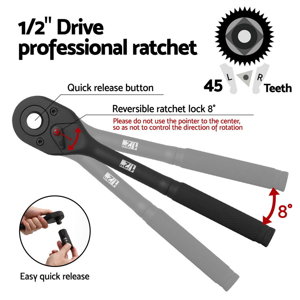 The Giantz 30-Piece 1/2" Drive Socket Set is built for both professionals and DIY users. Made from heat-treated chrome vanadium steel, these sockets deliver superior strength, hardness, and durability.