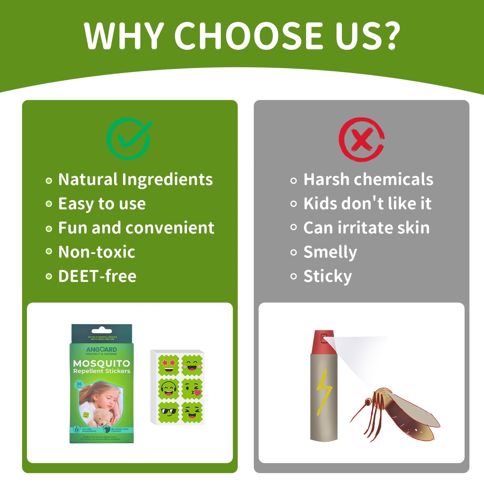 These ANGOARD Mosquito Repellent Stickers provide natural, plant-based protection using essential oils of lemongrass, lemon, and eucalyptus. Designed for children and adults alike, they create a 360° protective zone that lasts up to 5 hours per use — no sprays, no skin irritation, and no mess.