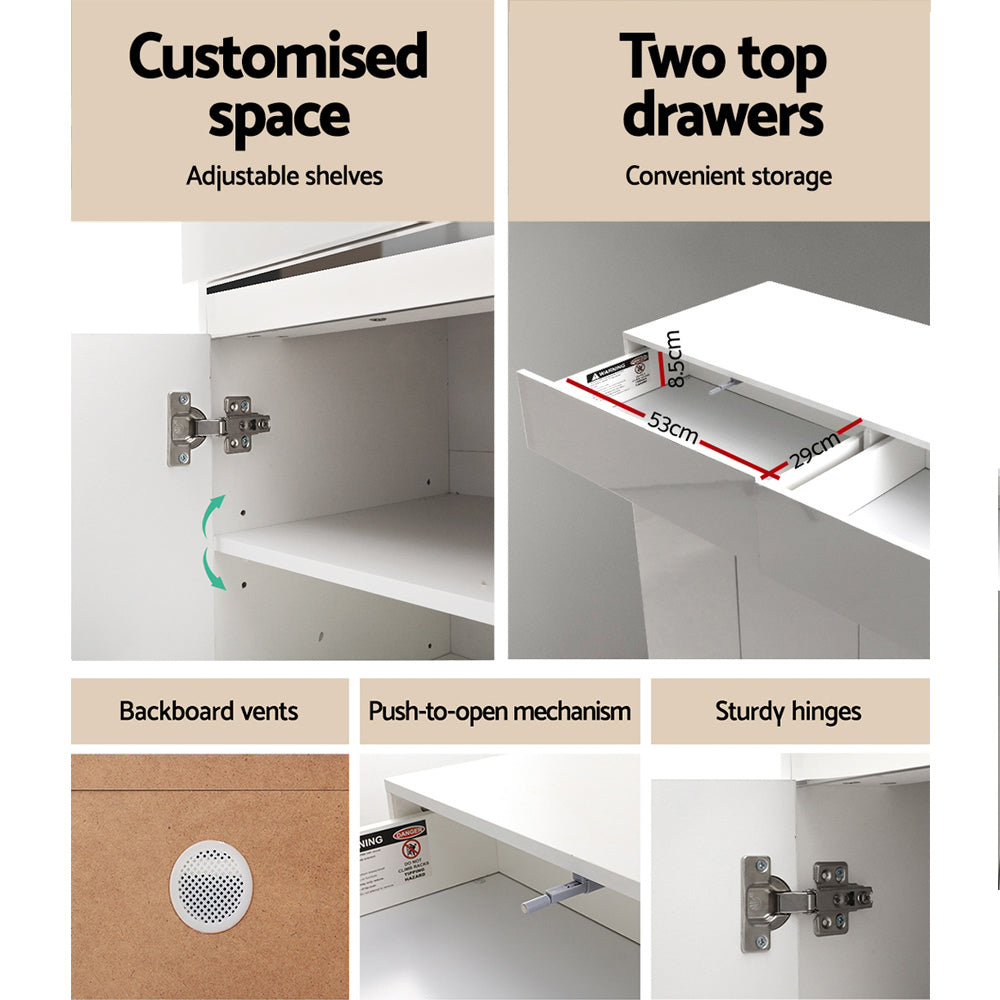 You are shoe proud. That is why you need ample space for all your wonderful footwear. And with our Artiss Shoe Cabinet, you will get all the space you need to neatly organise your shoes. Our high-quality shoe cabinet features shelves that are height-adjustable to accommodate different types of shoes and use. The cabinet has two cupboard areas of closed shelving to effortlessly house up to 26 pairs of footwear depending on size. Better still, you also get two top drawers for storing any other home essentials. Plus, the cabinet also features thoughtful backboard vents, handy push-to-open mechanism and sturdy hinges to enable the unit to stand up to robust use. Not least, the durable 12mm particle board and MDF construction, with an UV high-gloss finish on the front, make this shoe cabinet an attractive welcome to any home entrance.