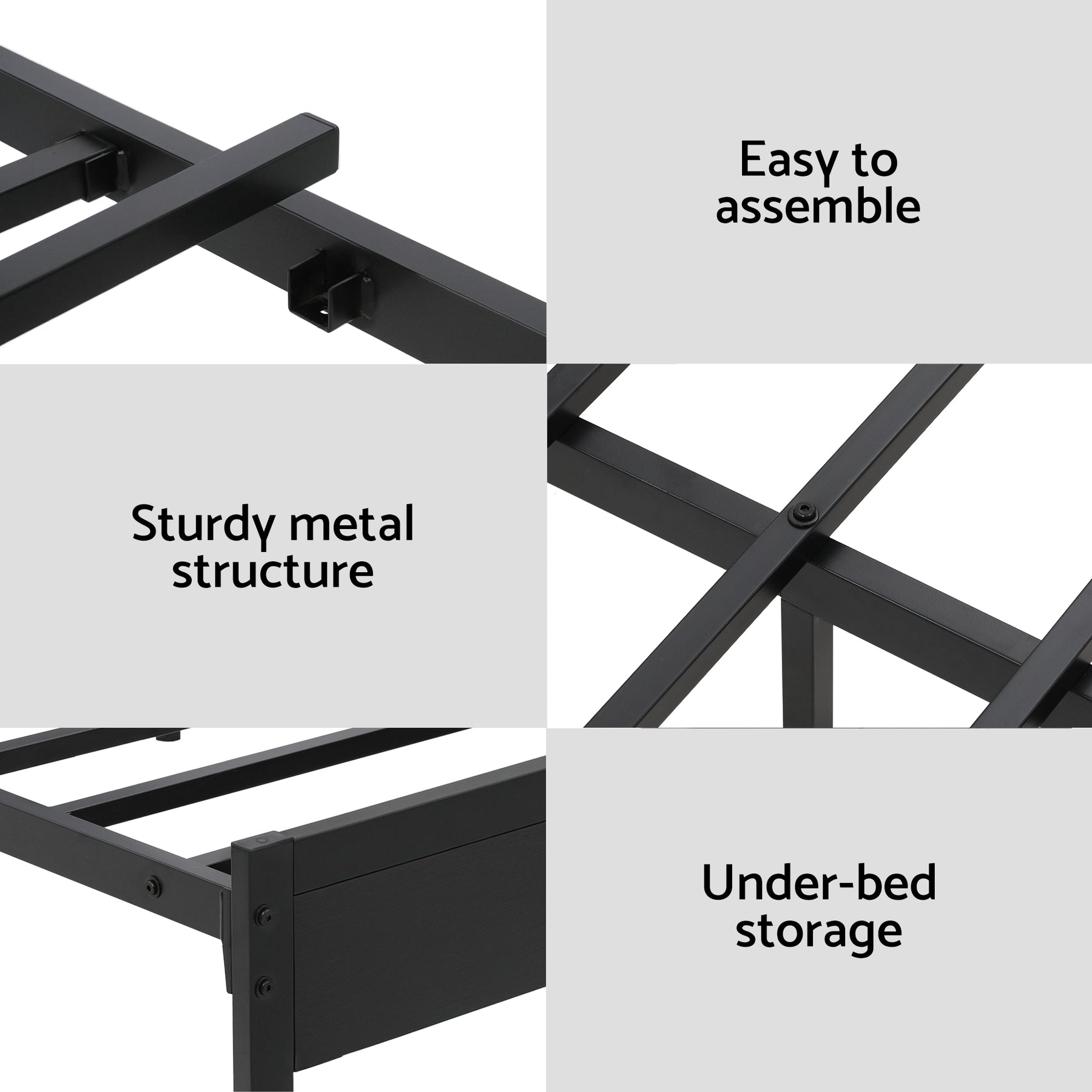 Transform your bedroom with POR metal bed frame that glows with style. Built-in LED strips offer 16 colours choices and multiple modes — Music, Mic, and Timing — to match your mood or playlist. Adjust colors and brightness through the mobile app for an immersive and personalized sleep space. The bed frame headboard shelves offer a convenient storage solution, keeping essentials within easy reach and providing an additional space for decorating your cherished home.This heavy duty metal platform bed frame with charging station,it is convenient for your tablets, cell phones or other electric devices.