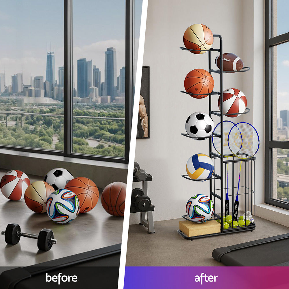 Tired of cluttered sports gear? The Everfit Ball Storage Rack is your Sports Equipment Organizer, designed for Aussie families, coaches, and fitness lovers. This Heavy Duty Ball storage rack basketballs, footballs, and volleyballs securely in its 7-tier rack, while the thoughtful side storage bin conveniently holds baseball bats, badminton rackets, or tennis rackets��keeping all equipment in one place. Perfect for garages, home gyms, or outdoor courts, it features easy assembly, steel frames for durability. Ventilated baskets prevent moisture buildup, and the compact footprint suits small spaces. Whether you're a parent managing kids' gear or a coach organizing team equipment, this Ball Storage for Indoor and Outdoor ensures everything stays tidy and accessible.