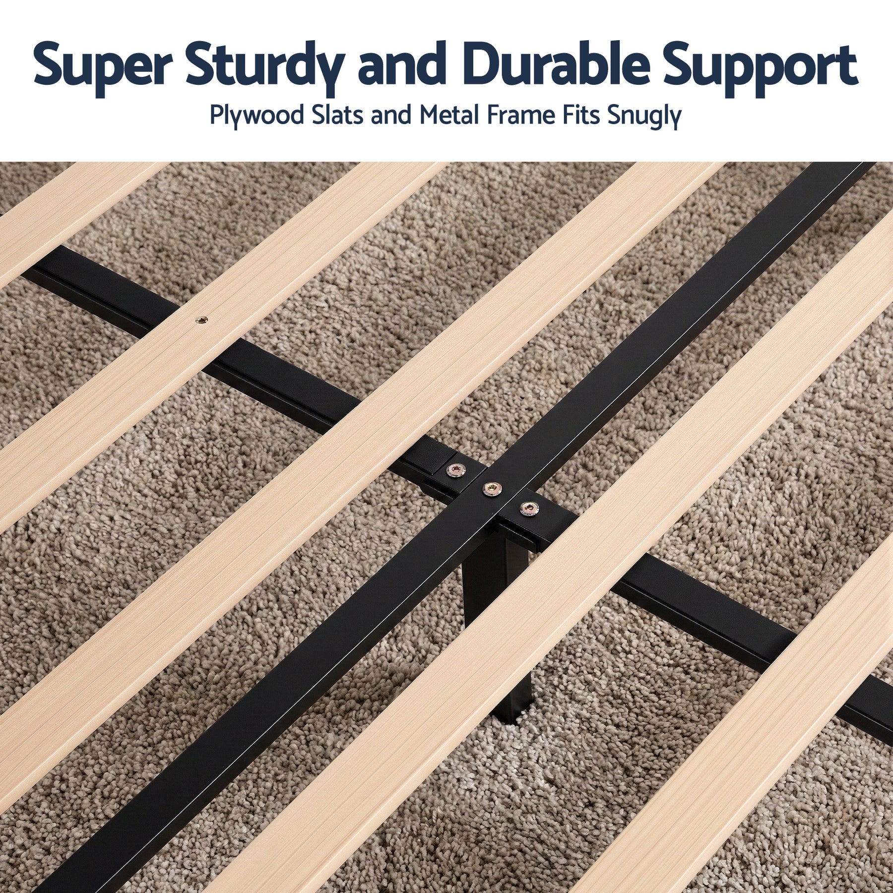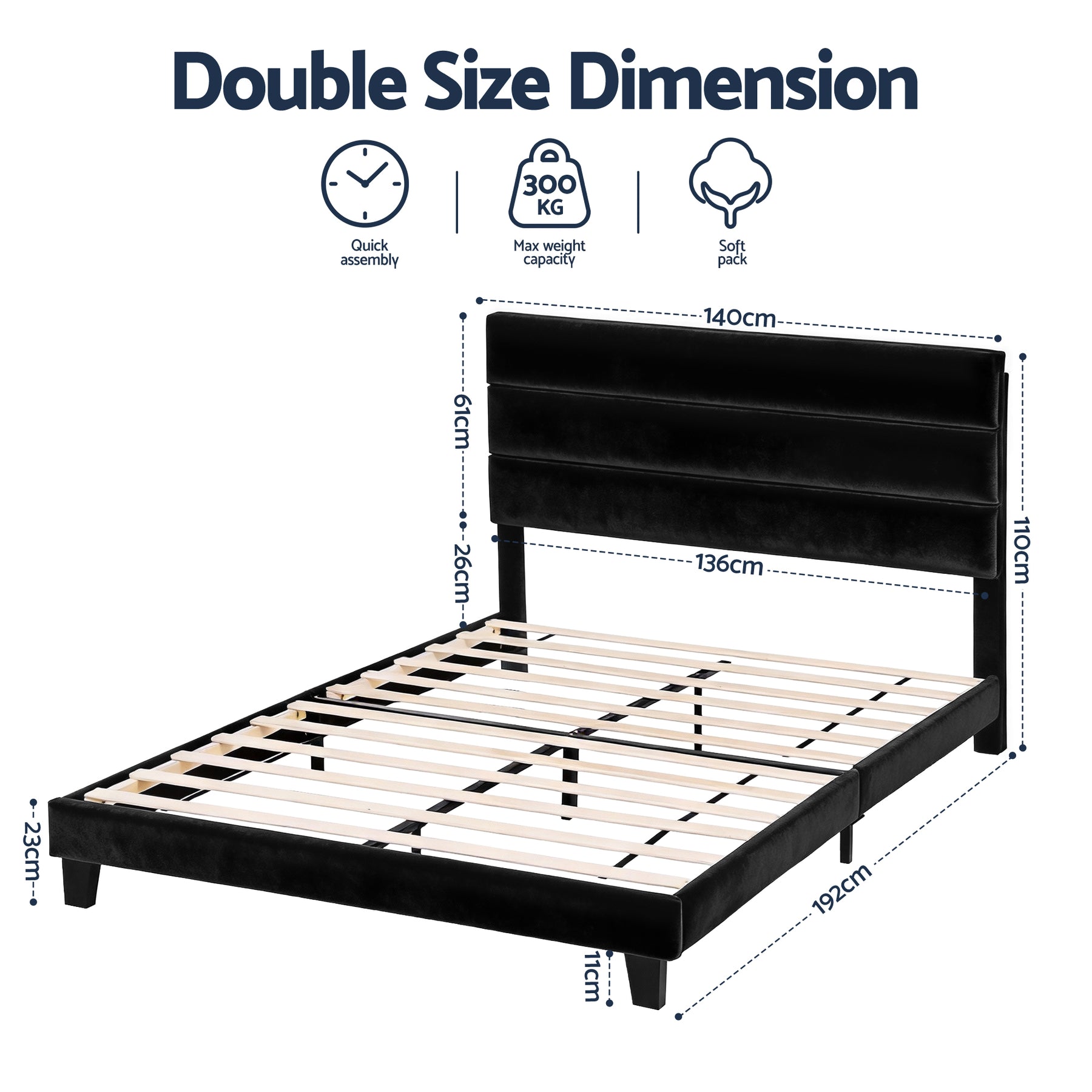 Elevate your bedroom with the Artiss Double Bed Frame. Featuring plush black velvet upholstery and a modern geometric headboard, this platform bed frame offers effortless assembly and robust support. Engineered with pine wood, metal legs, and 12 plywood slats, it holds 300kg securely. The skin-friendly velvet fabric is simple to maintain, while its versatile black design complements any decor. A durable, space-saving solution for contemporary homes