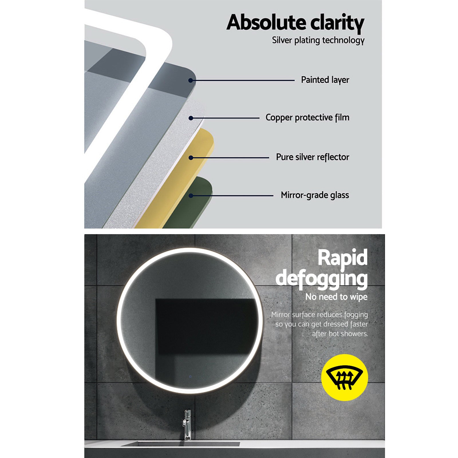 Fairest beauty looks even better with our Embellir LED Mirror. With it large 90cm diameter, the mirror is strong and made to last. It also features an energy-efficient LED light strip that goes around the circumference of the mirror to add vivid illumination to its reflections. The waterproof LED strip has a longlasting working lifespan of up to 50,000 hours. The light can be easily turned on and off with just a touch switch. Or long press to change the brightness. Better still, the rapid defogging mirror surface means that you can keep the mirror in the bathroom without needing to wipe it up after every hot shower. Not least, the mirror also includes wall mounting accessories for an easy install.