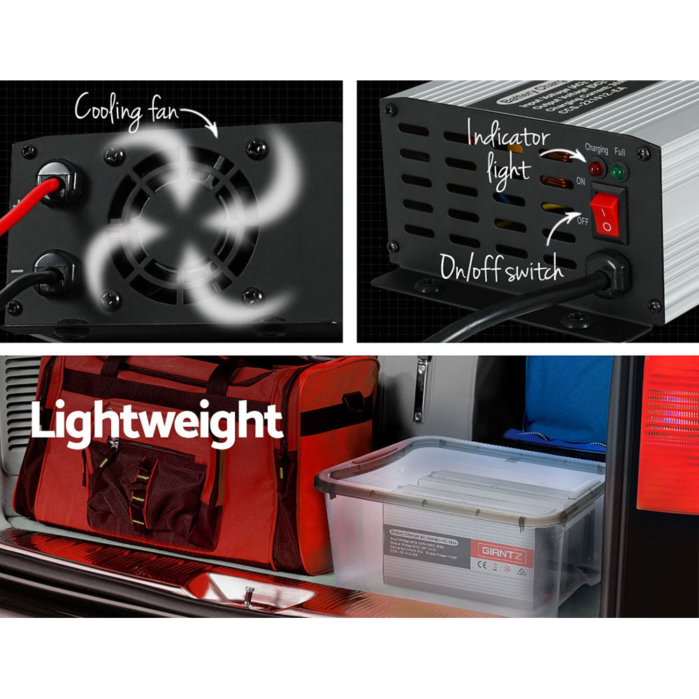 There are few things more annoying than a flat battery. Luckily, you can get back on the road again in no time with a Giantz 30A Battery Charger. Not only is it SAA and CE approved, but the battery comes with a wide variety of in-built safety features including short circuit protection, over-voltage protection, over-current protection and over-heating protection. Equipped with integrated Pulse Width Modulation (PWM) to prevent power loss, the charger provides continuous charge to a 12V battery with an automatic floating charge mode to avoid overcharging damage. That means safe charging with total peace of mind. Includes two quality battery clips with a silicone shell, pure copper core and 85cm cable. Suitable for gel-cell and wet-cell lead acid batteries, the charger can be used to revitalize your car, caravan, boat or bike: whatever you need to get you back on the road. Portable and weighing only 1.7kg, the charger is as equally useful to you on the road as it is in your workshop, garage or shed. Never let your devices down again: power up with the Giantz 30A Battery Charger.