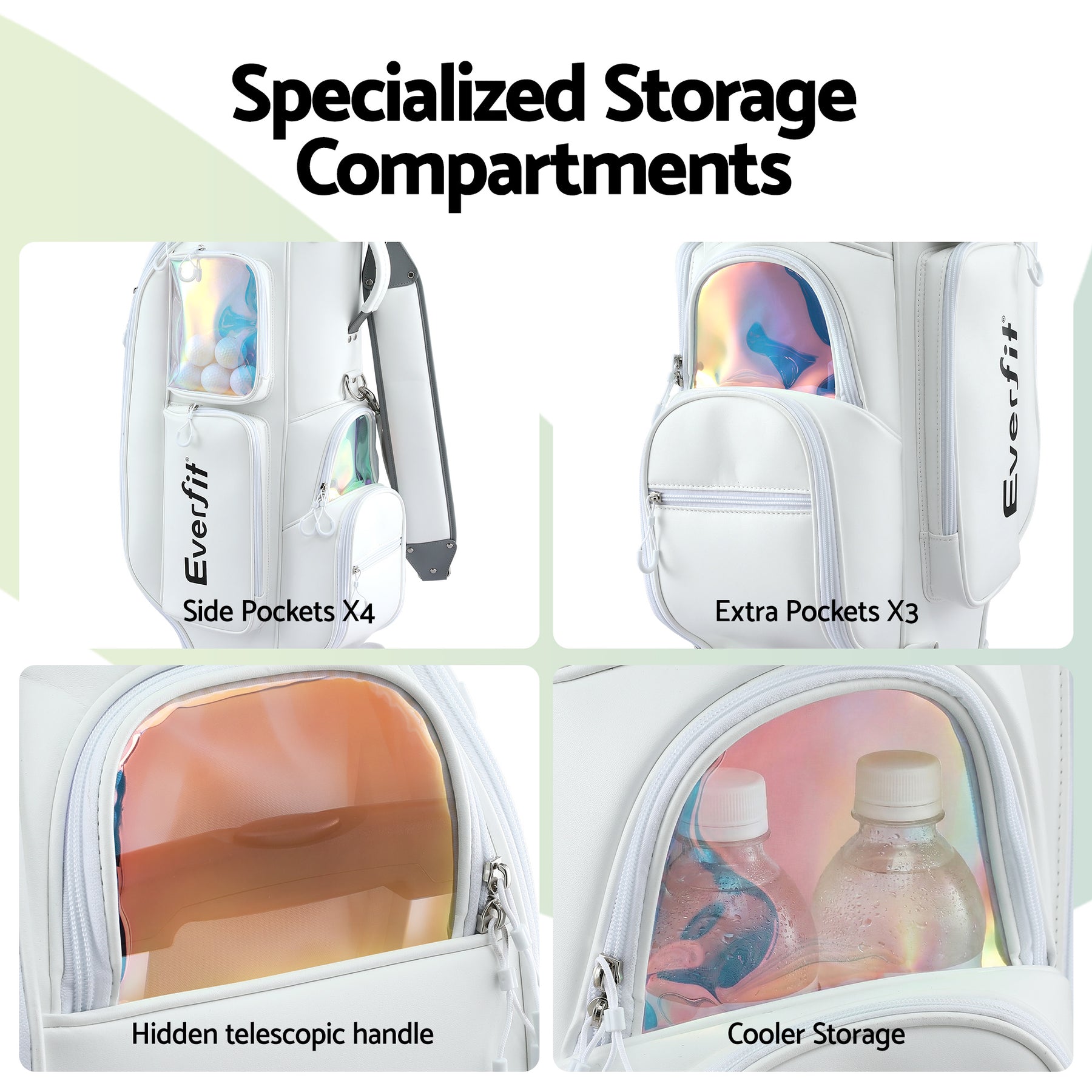 Navigate the green effortlessly with the Everfit rolling golf cart bag. This premium synthetic leather buggy club organiser features a spinner wheel base, telescopic handle, and built-in cooler pocket. Complete with a clear retractable hood and independent dividers for smart equipment storage.