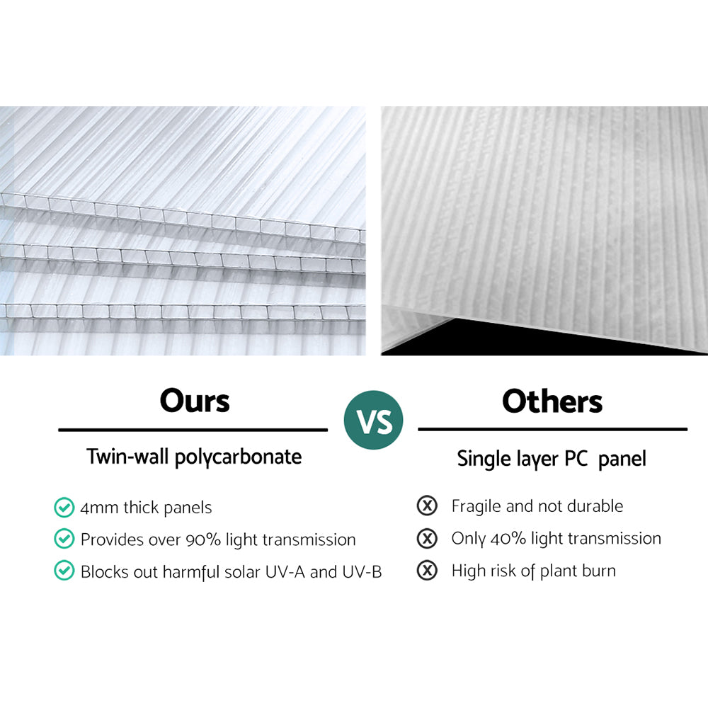 This spacious greenhouse has a massive volume of 17.40m³ and can accommodate a considerable number of plants and vegetables. Covered with twin-wall UV-resistant polycarbonate panels, the Green house allows up to 90% light transmission and helps to eliminate the risk of plant burn effectively. It also has a unique triangular Aluminium framework for enhanced durability and stability, two adjustable roof vents for good air flow and moisture and not least, an effective gutter system for smooth drainage.