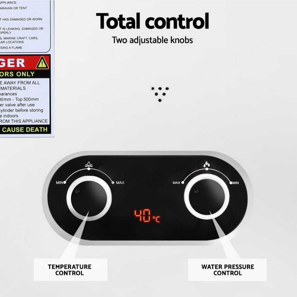 Experience the luxury of a warm shower in the great outdoors with the Devanti Gas Water Heater. This versatile and efficient outdoor showering solution offers convenience, clearly displayed on its LED screen. Safety is paramount, with a built-in processor limiting the maximum water temperature to 60�C, to help preventing any accidents. The showerhead features an automatic on/off trigger for easy operation, while a variety of additional safety features ensure worry-free use. Designed for portability and ease of use, the Devanti Gas Water Heater comes equipped with a handy carry handle and all necessary mounting brackets for quick and hassle-free setup. Its lightweight construction makes it ideal for camping trips, beach outings, or any outdoor adventure where a warm shower is desired. With both winter and summer settings and adjustable water flow this LPG-powered heater offers a perfect blend of comfort and practicality for outdoor enthusiasts. Enjoy the freedom of the open country without sacrificing the comfort of a warm shower � the Devanti Gas Water Heater is your perfect outdoor companion.
