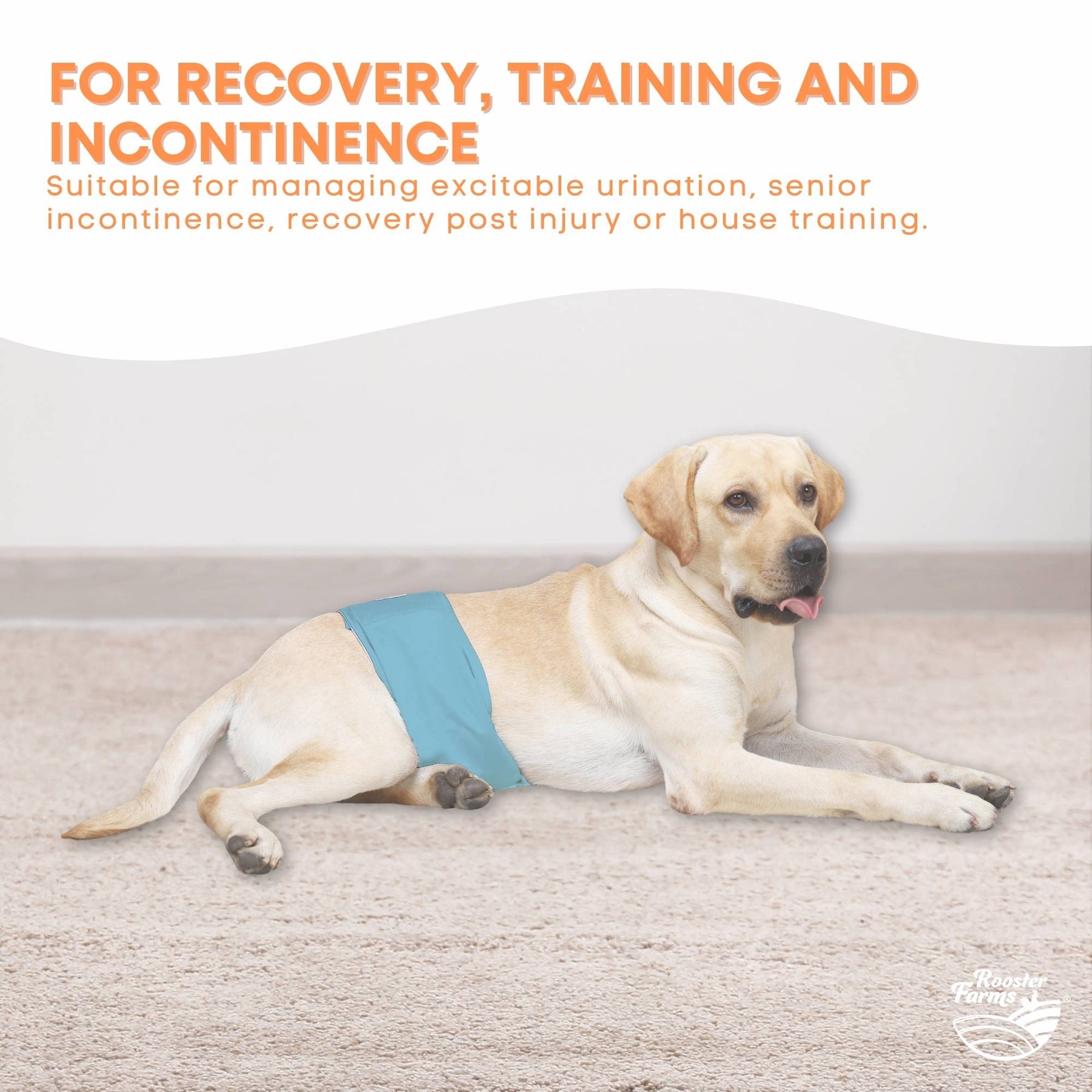 Rooster Farms Male Dog Diapers 3-Pk Washable Reusable Nappies Hook + Loop Fit will keep your dog comfortable and your home clean! Designed with a leak-proof three-layer core and secure elastic openings, these reusable nappies are perfect for incontinence, excitable urination, or recovery. Machine washable and eco-friendly for everyday use.