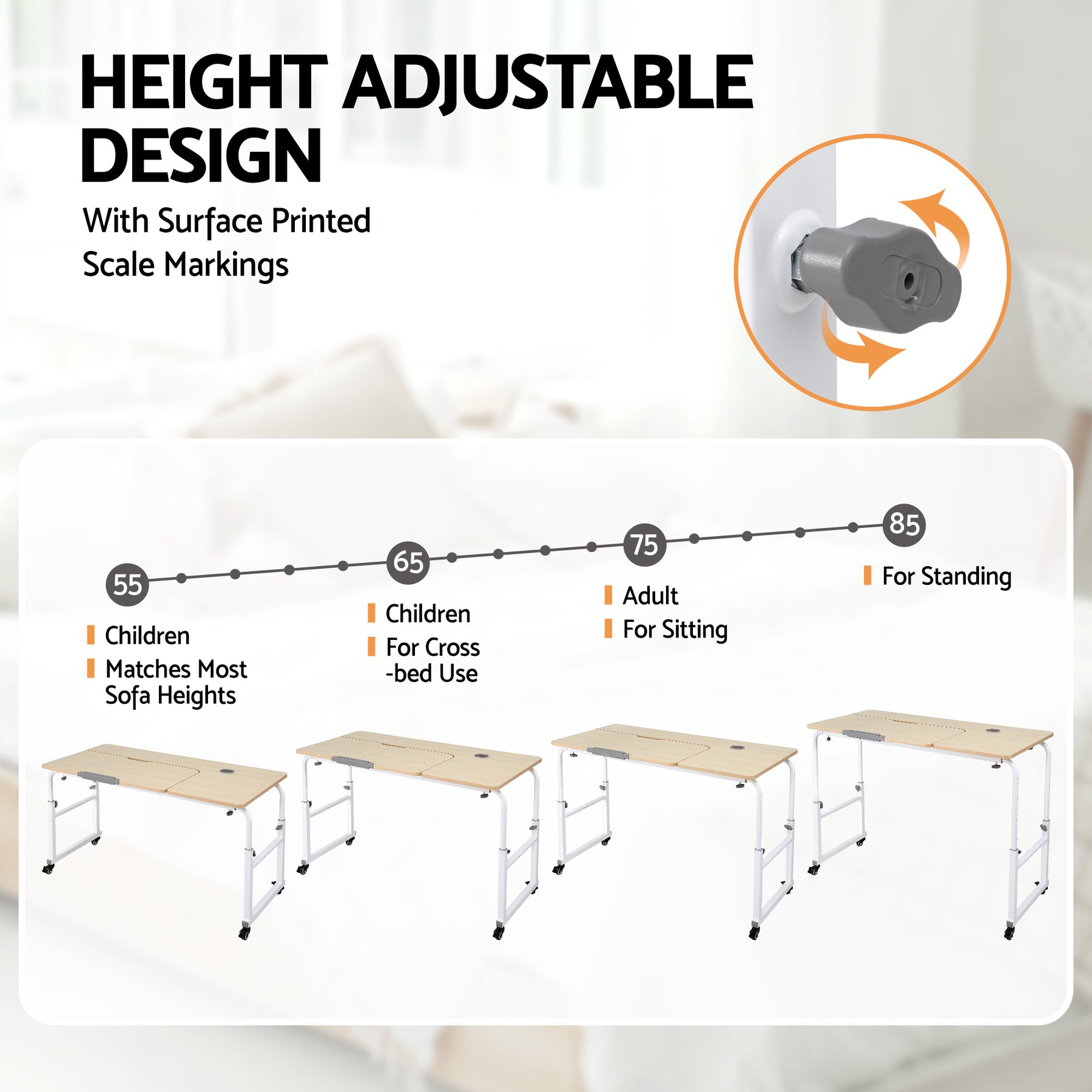 Work comfortably anywhere with the Artiss Laptop Desk. Featuring a fully adjustable height and width frame, it slides easily over beds or sofas. The split desktop tilts up to 60 degrees for ergonomic drawing or typing, while lockable wheels ensure stability. An ideal mobile home office solution.