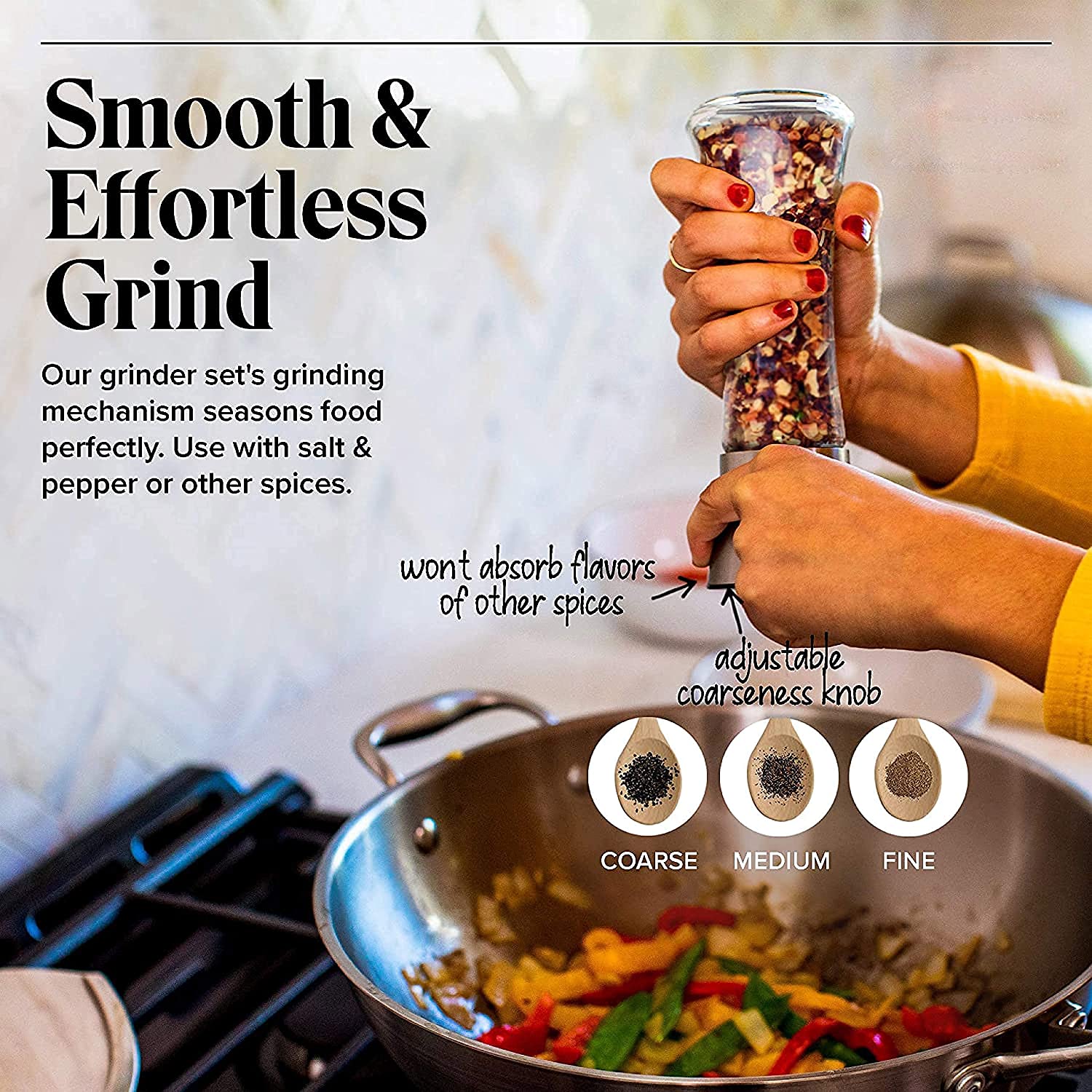 Built for Convenience and Function: unlike other spice grinder sets, this salt and peppermill pair have their grinding mechanism on the top of the grinder, ensuring salt and pepper ends up only on your food -- not all over your table. The ceramic grinder is non-corrosive and won't absorb flavors, while a plastic knob on top of each salt and pepper mill allows you to easily adjust from a fine to coarse grind.
