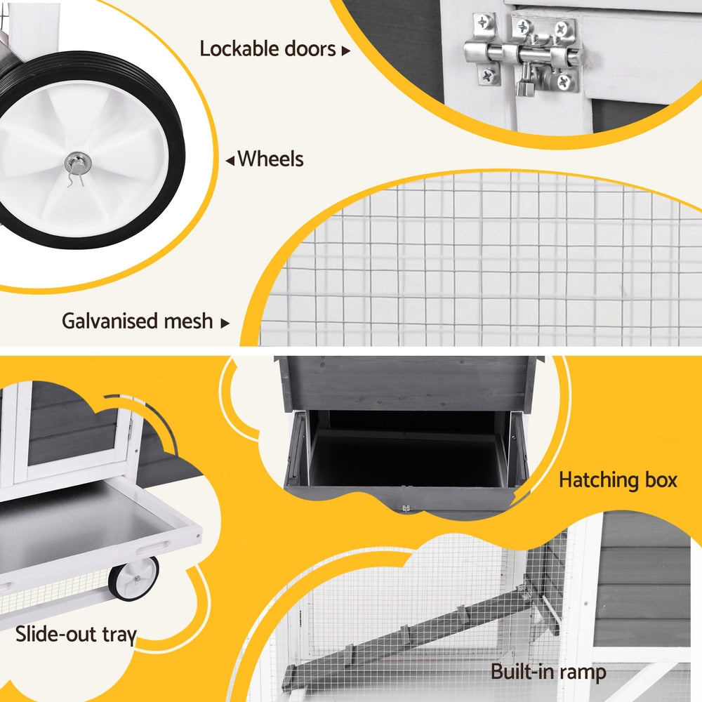 The i.Pet Chicken Coop, designed with a hatching box for easy egg collection and two wheels for portability, offers a secure and convenient home for your chickens. Crafted for durability and weather resistance, it ensures comfort and mobility.