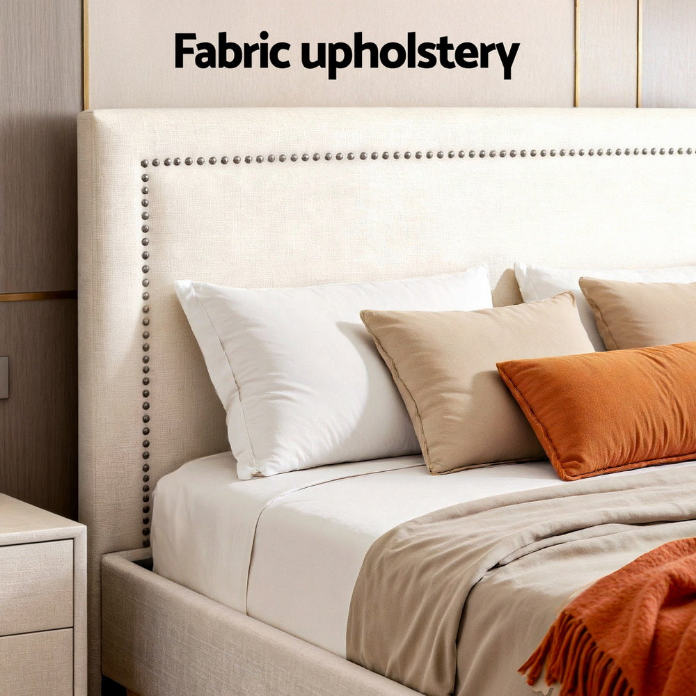 This Artiss Queen Bed Frame combines style and support. The platform bed base features a robust wooden frame with reinforced slats and heavy-duty metal connectors, offering strong 300KG capacity. Upholstered in premium linen-look fabric with smooth edges, it includes a contemporary headboard. The padded headboard, with its subtle nail-edge detail, arrives fully assembled. The sturdy base requires assembly. Finished in a versatile beige tone. Note: Actual colour may vary slightly.