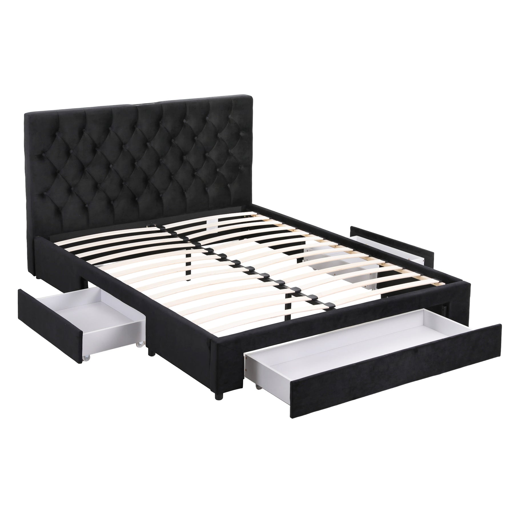 Elevate your bedroom with the Queen upholstered bed frame. This Queen bed frame combines premium velvet fabric with pine wood construction for lasting durability. Maximise space with three wheeled storage drawers – two bedside, one oversized foot drawer. The integrated charging station features SAA-certified sockets, USB and Type-C ports for convenient device powering. Engineered with reinforced bent plywood slats and smooth-gliding rollers, it offers effortless storage access. Perfectly sized for Australian bedrooms, this storage bed with charging functionality blends practicality with contemporary style.