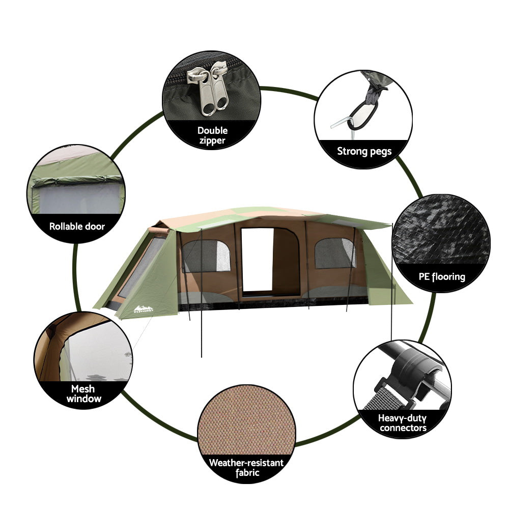 Embrace nature's call with our 10-person Weisshorn Instant Camping Tent. Designed for the true outdoor enthusiast, its robust polyester fly stands as a barrier against unpredictable weather with UV protection and PU3000 water resistance. The tent features an instant and integrated frame for easy pitching and pack-up. Welded floor corners provide additional weather protection. Wide windows and a central door seamlessly merge the inside with the ambient sounds and coolness of the outdoors and can be rolled up for even better ventilation. A double-sided zipper ensures you can get in and out with ease. With a generous front vestibule and built-in storage pockets, your adventure equipment finds a safe shelter. Dive deeper into nature's wonders with a Weisshorn Instant Camping Tent.